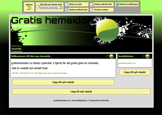 Nedan är en bild tagen från administrationsgränssnittet när man är inloggad och bygger sin hemsida på Cybersite.